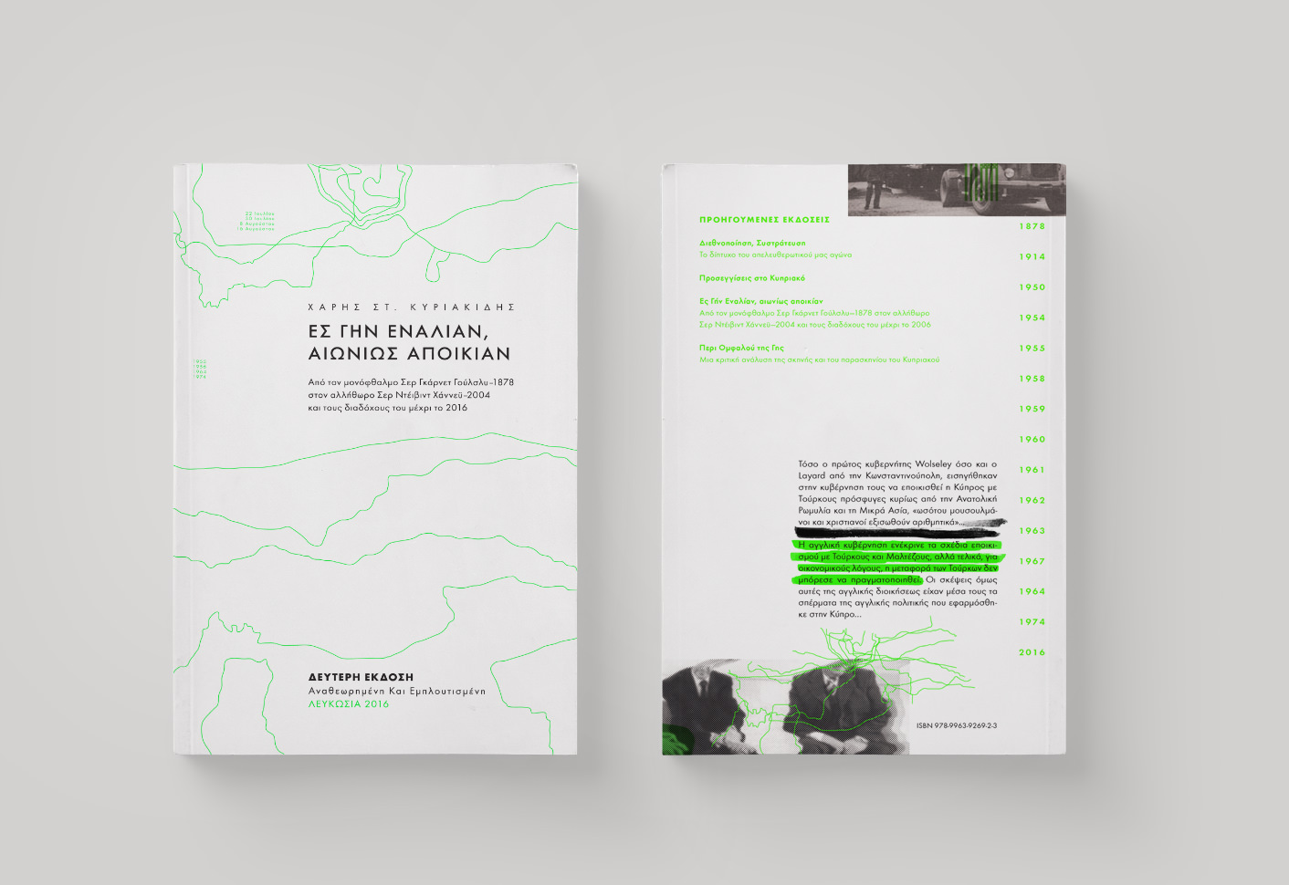 All design decisions concerning the creation of this book have been supported by deep research of its content as well as impulsive design play and experimentation. From the custom grid that was based on Van de Graaf’s and Tschichold’s principles to the instinctual experimental collage of 60 year old magazines. This, slightly smaller than the crown octavo size, book is focused on the recent political situation of Cyprus and how history is shaped or even crafted.
